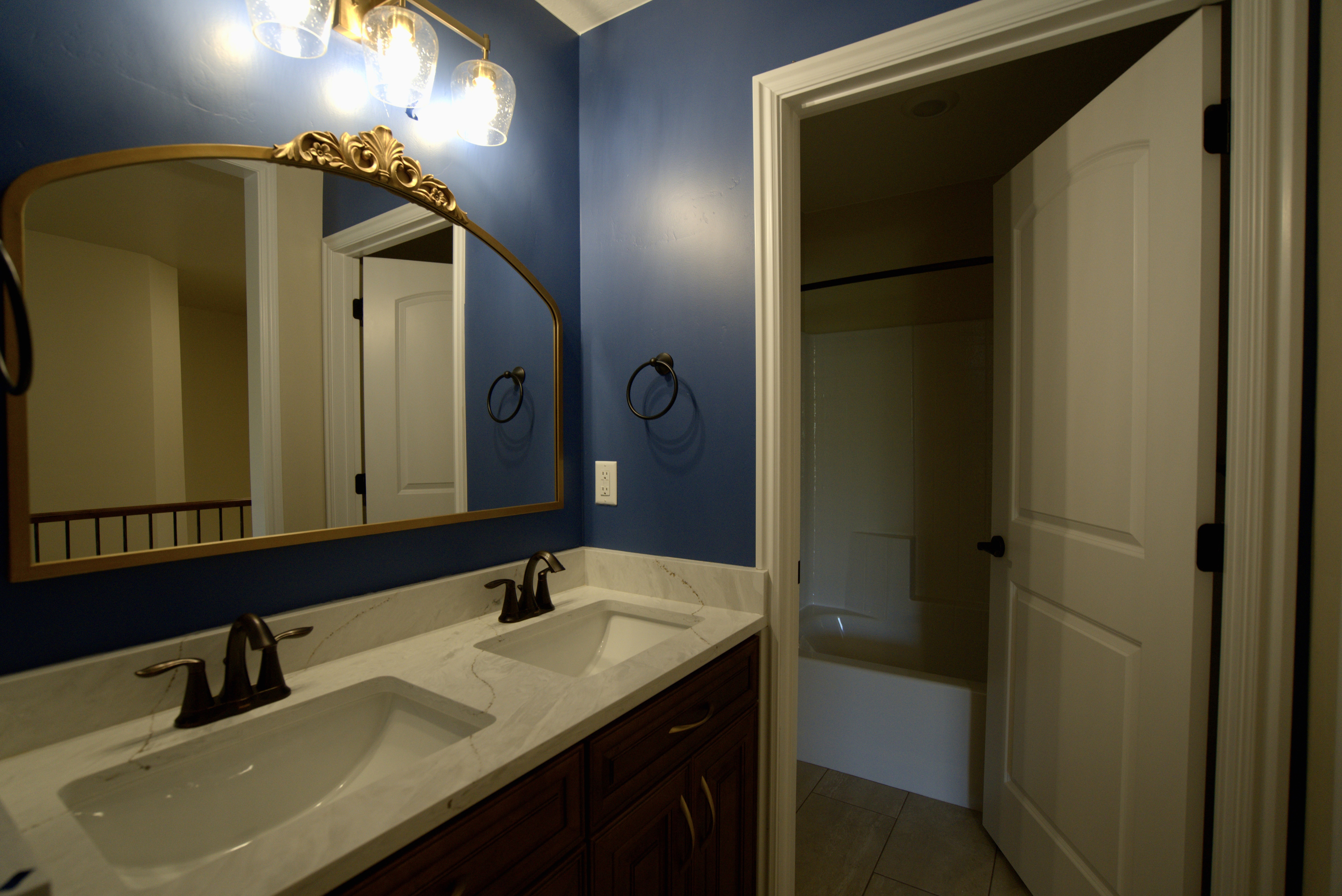 This home pairs bold color and timeless elegance for a storybook feel. Rich painted accent walls and a mix of dark and white cabinetry create depth and contrast, while the white shaker kitchen with gold finishes and chandeliers adds a touch of luxury and warmth throughout.